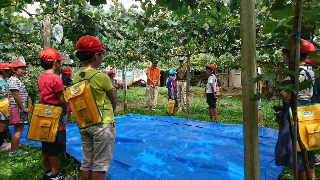 小学生がぶどう園を見学 9月5日、韮崎市立穂坂小学校の児童が、相山泰さん(JA梨北非常勤理事)のぶどう園を見学しました。 ぶどう栽培に必要な農機具、穂坂地区で栽培している品種など、児童の質問に対し、相山さんは丁寧に説明しました。